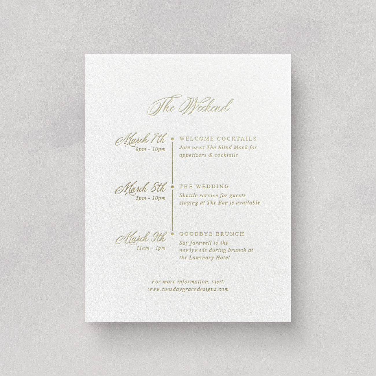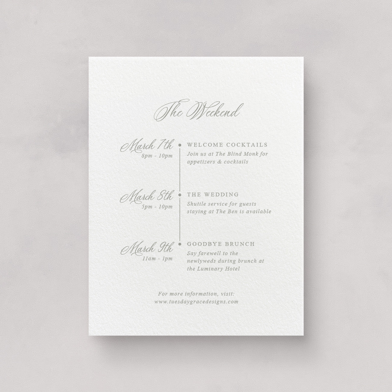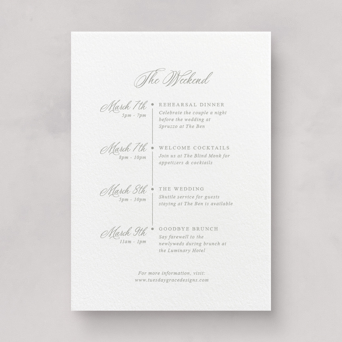 Add the Estate Wedding Weekend Cards to your invitation suite to share a timeline of events surrounding the day of your wedding and reception.