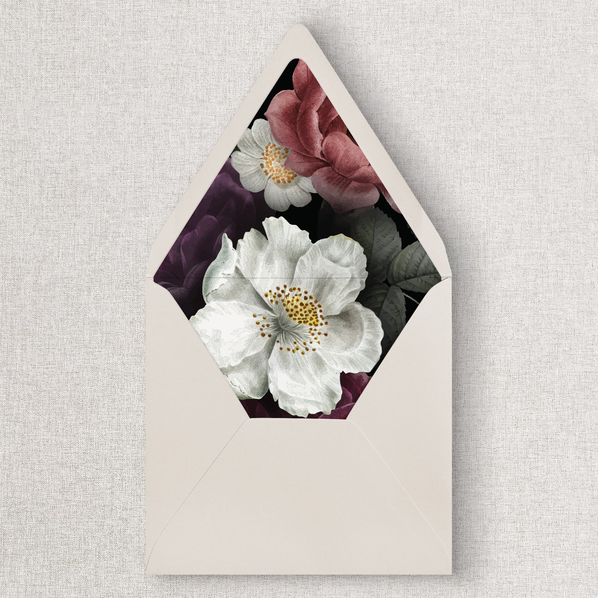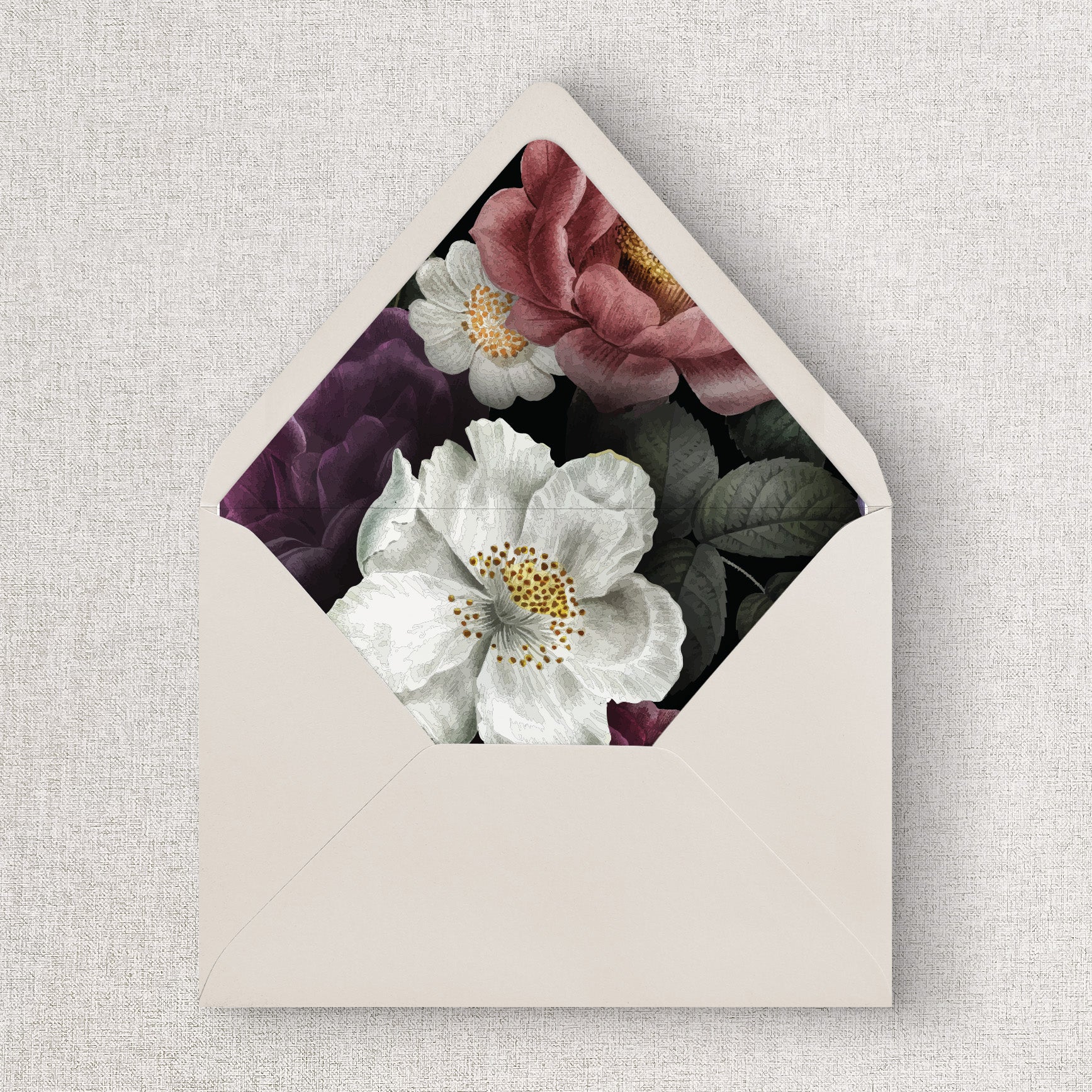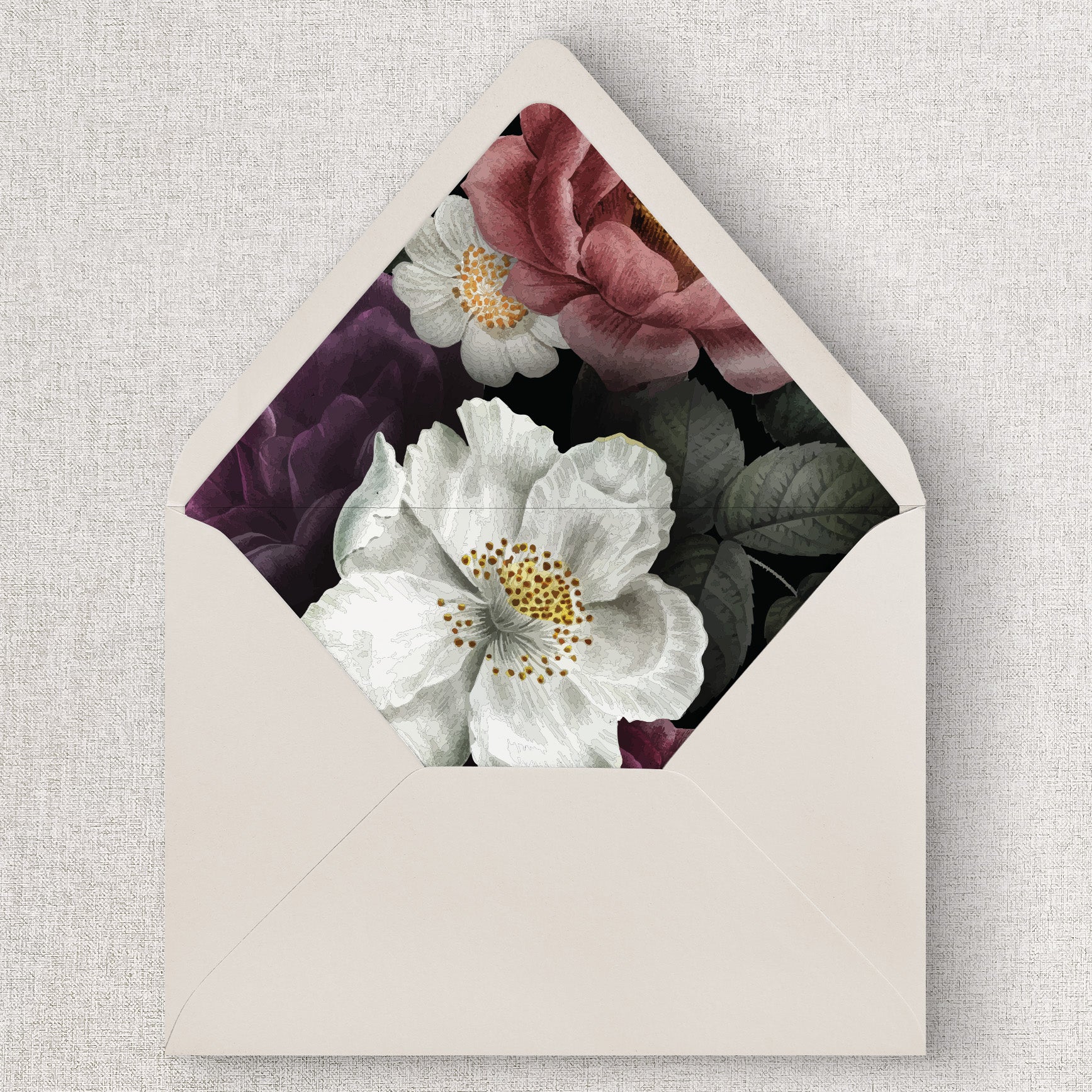 Give your guests a great first impression of your wedding invitations with an beautifully designed Outer Envelope Liner. The Moody Floral Envelope Liner is seen in The Normandy Wedding Invitation Collection.