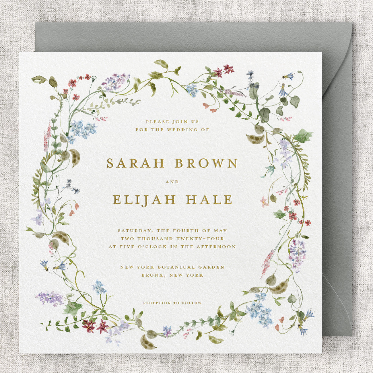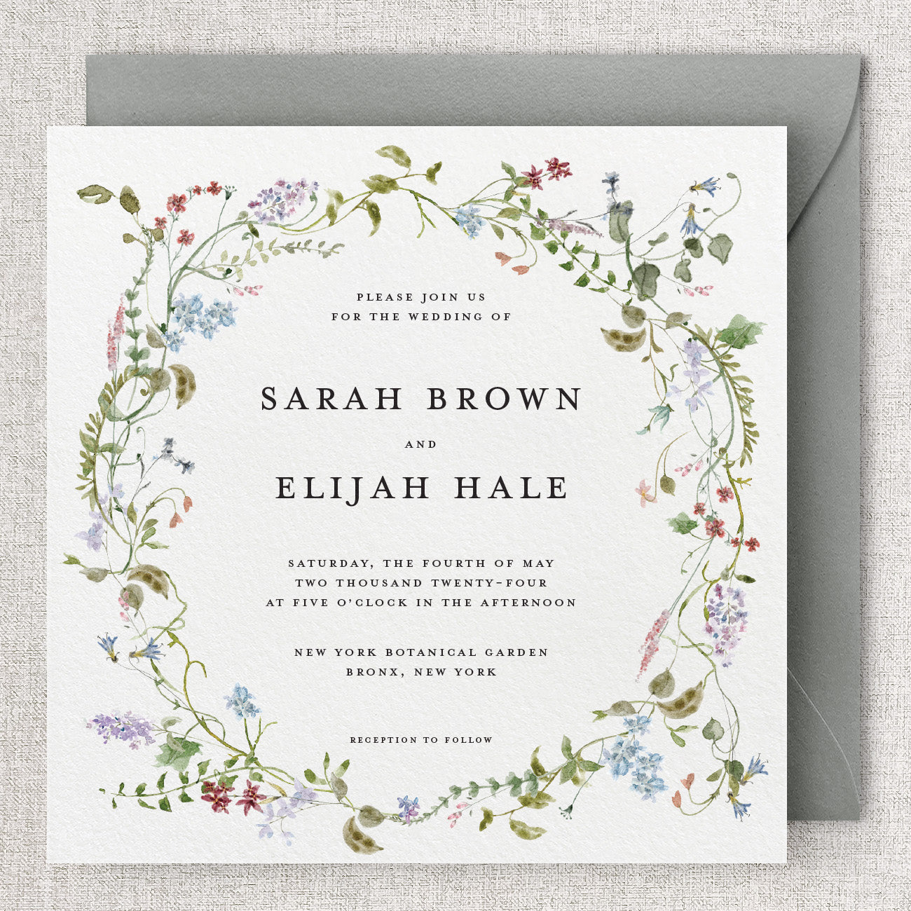 The Wild Flora Wedding Square Invitation features a romantic watercolor flower wreath, full of lilacs, delphinium, hollyhocks and other fauna fit for a wildflower garden. This suite is perfect for a garden wedding or a couple who loves flowers.